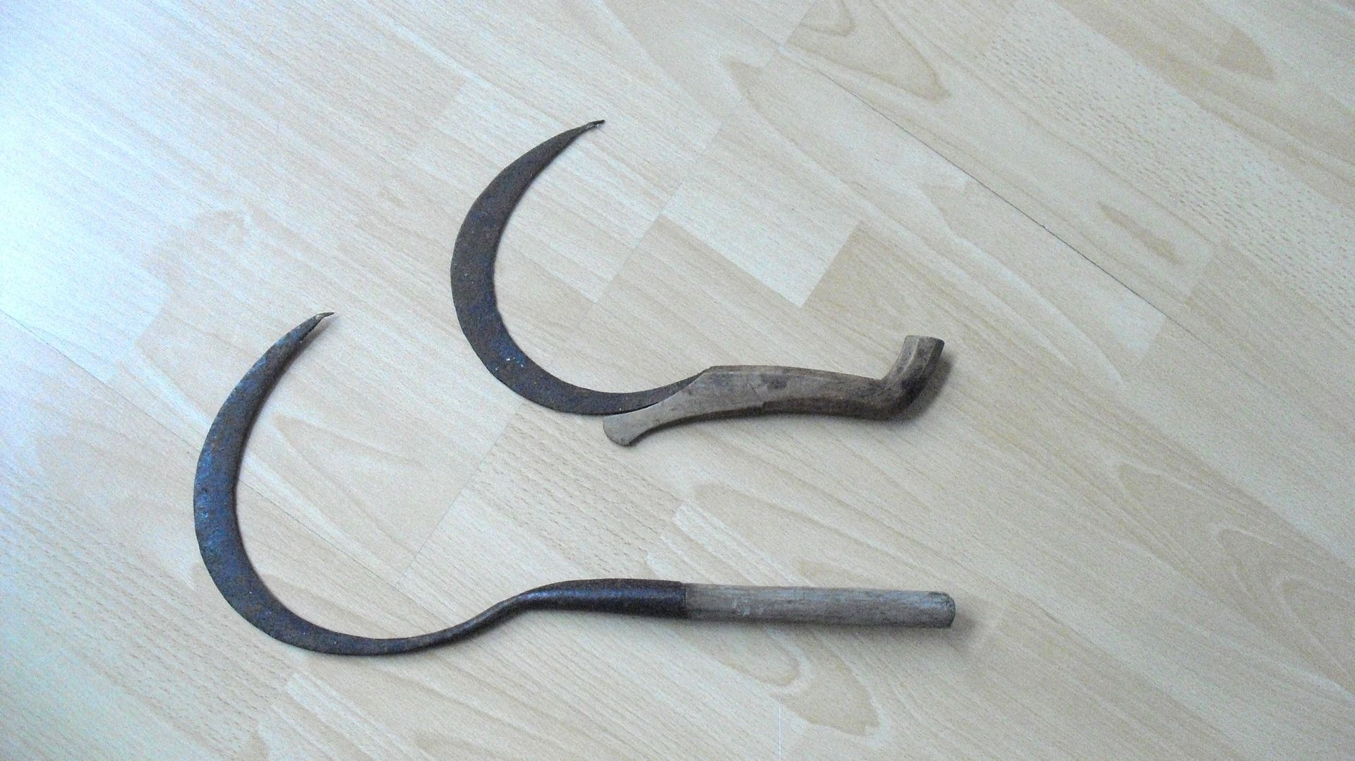 2 oude sikkels uit Thailand met een rustieke houten handvat. De bladen vertonen tekenen van ouderdom en gebruik, wat bijdraagt aan de charme.